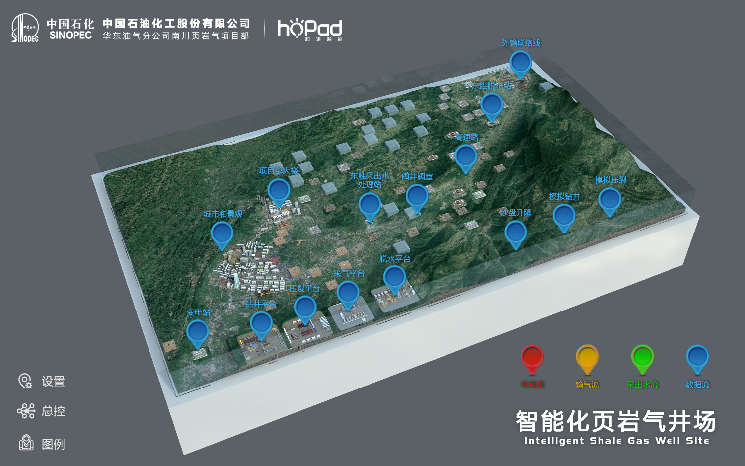 中石化重庆页岩气智慧井场演示系统主要以南川地形、地貌、南川城市布局为基础,以南川页岩气项目部新大楼为中心点,展现项目部在页岩气钻井、压裂、采气、脱水、销售全流程的规划和布局。将南川页岩气井的总体情况分为“部署平台、钻前平台、钻井平台、压裂平台、采气站、脱水站”6种状态予以呈现。